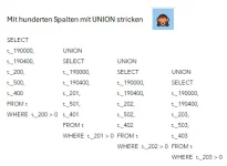 eine Datenbanktabelle ist so angelegt, dass die PosNr. in der ersten 4 Spalten sind. Die nächsten 4 Spalten haben die Mengen für die davor erwähnten Positionen. Die weiteren 5 Spalten haben die Artikelnummern. Ich möchte die Daten aus diesen Blöcken so auslesen, dass ich die Menge pro Artikel habe. Im Anhang ist ein Bild hierzu. Ich könnte es mit UNION zusammen bringen. Nun sind es in der Tat keine 4 sondern hunderte Spalten. Gebe es bestimmt eine andere Möglichkeit, es zu lösen?